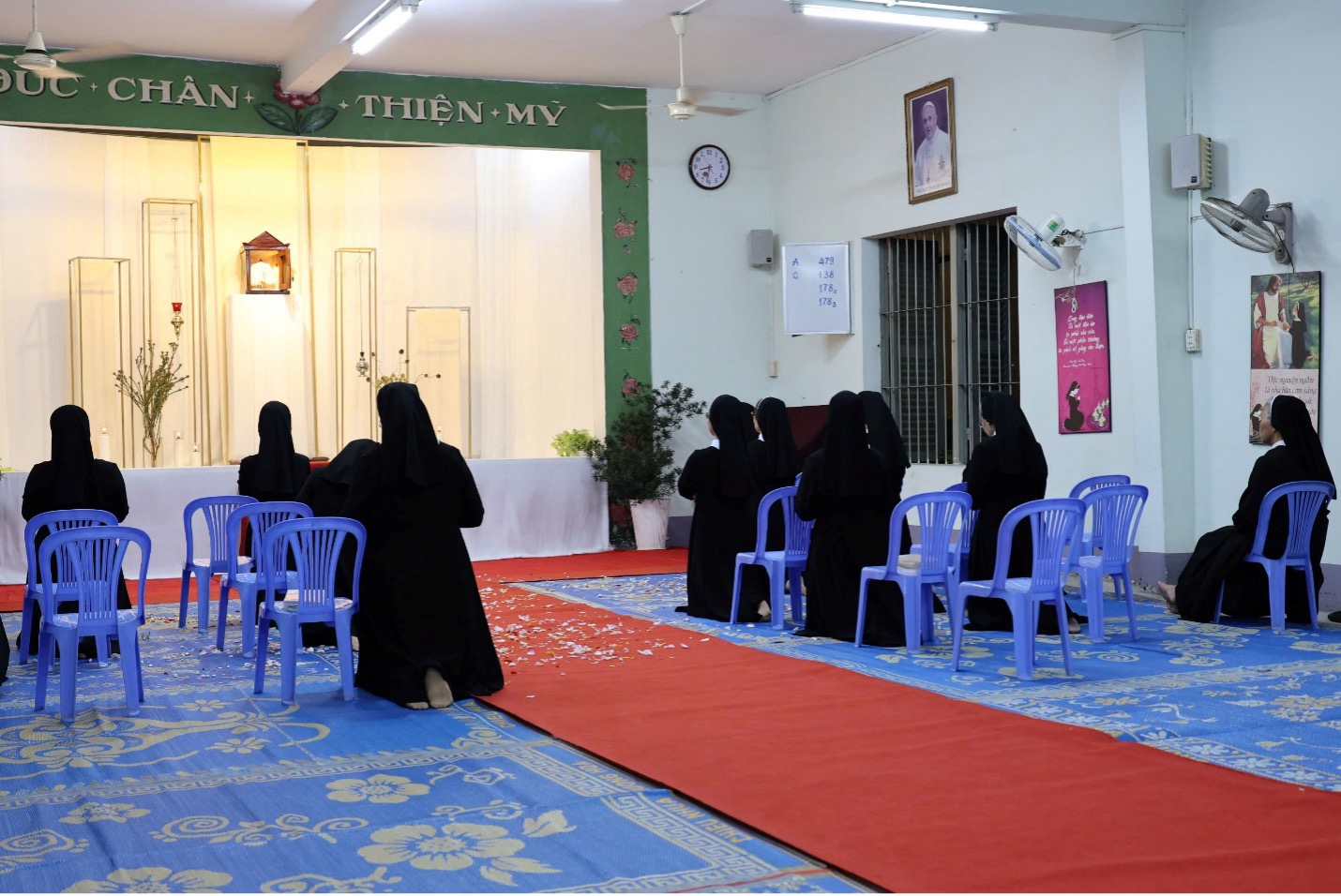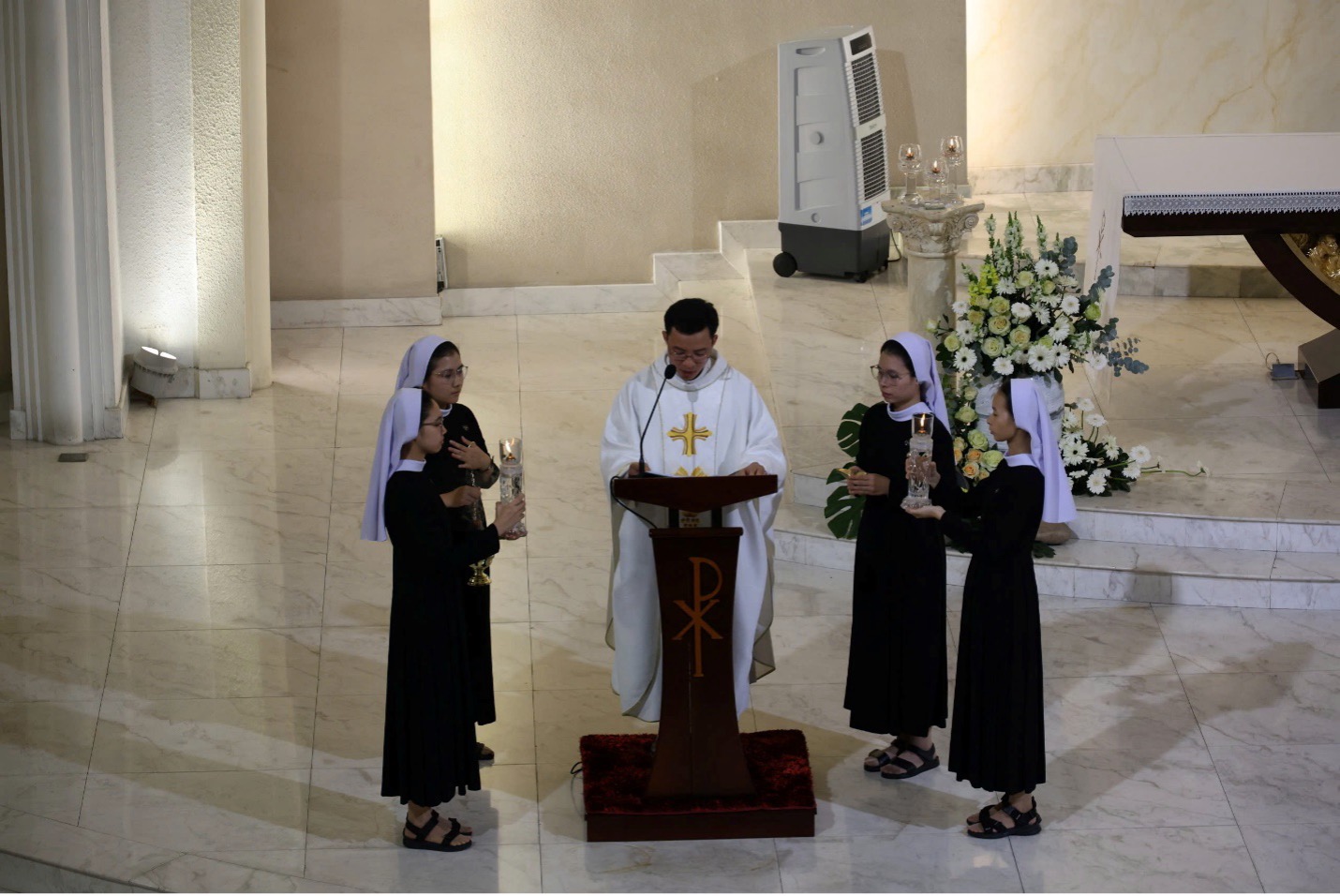 Tại Nguyện đường Dòng Con Đức Mẹ Mân Côi – Chí Hòa, Thánh lễ Tiệc Ly được cử hành lúc 19g00 do cha Vinh Sơn Trần Văn Đỉnh, SJ. chủ tế, với sự tham dự đông đảo của quý Sơ nhà Tỉnh Dòng và cộng đoàn giáo dân.